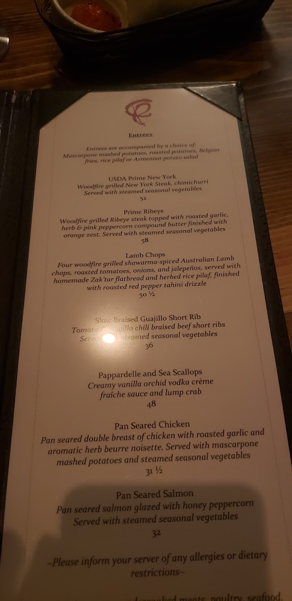 Wow! The best service we've ever had! Our waitress/bartender was so attentive and always acknowledged us. We got ribeye steak and bread pudding bites....everything delicious. The restaurant itself is not as big as I thought it would be but it's very nice. Upscale dining. Gourmet plates. Our total was 88 for 2 drinks, 1 entree, and 1 dessert. Dark ambience. I do not recommend sitting by the entrance because we had the cold air hitting us constantly...winter time:/ But 5 stars for the service!!!